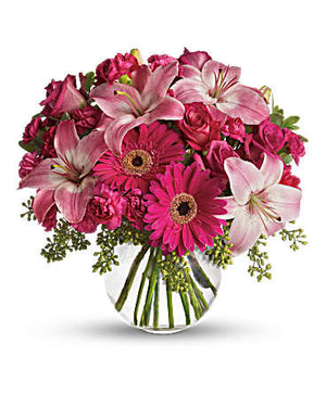 Sometimes all you need is a little pink me up! An ideal pick for anyone whose favorite color is pink, this stylish mix is full of variety and comes presented in a clear glass bubble bowl they'll use again and again.