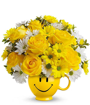 Sending someone a smile is as easy and sending them this smiling flower bouquet. The Be Happy Bouquet is the perfect give to turn someone's day around. This yellow smiley face mug is overflowing with seasonal yellow flowers such as daisies and roses, accompanied by white daisies sprinkled in. The best part is that the mug, after a good washing, is reusable, this this really will bring them a smile day after day. Perfect for morning coffee or afternoon tea, the this yellow treat is worth giving.