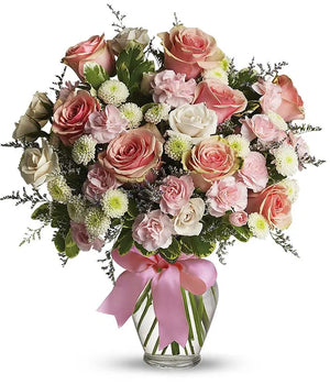 The Cotton Candy bouquet is the perfect arrangement to send to someone special in your life. It includes beautiful light pink and white roses; all beautifully arranged in a glass vase accented with a light pink bow.