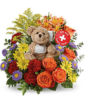 Wish them a speedy recovery with this hand-delivered, thoughtful surprise of fresh mixed flowers and sweet snuggles from this charming Beary Well Bear plush bouquet!