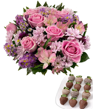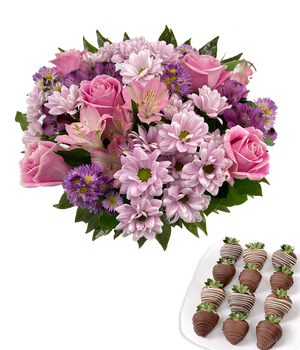 Treat someone special to a gift that's as sweet as it is beautiful. This charming bundle features a soft and elegant bouquet of pink roses, lavender cushion poms, pink and purple alstroemeria, and purple asters, all arranged in a clear glass vase for a timeless presentation. Paired with a decadent assortment of chocolate-covered strawberries, each drizzled with elegant swizzles, this gift is perfect for birthdays, anniversaries, or simply showing you care. It's a graceful blend of floral beauty and indulgent flavor they're sure to remember.