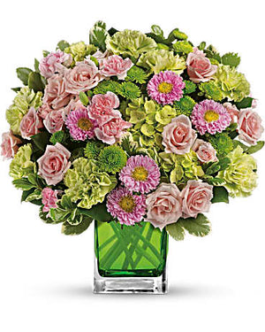 This sweet bouquet includes a vast array of green miniature hydrangea and light pink spray roses arranged in our citrus green glass cube.