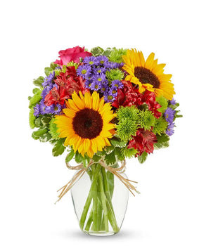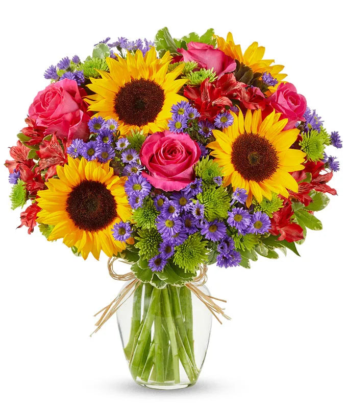 Send a cheerful burst of sunshine with this vibrant bouquet, perfect for birthdays, celebrations, or just to brighten someone's day. Radiant sunflowers steal the spotlight, beautifully complemented by hot pink roses, red alstroemeria, purple Monte Casino asters, and lively green poms. Arranged in a clear glass vase and tied with rustic raffia, this colorful mix brings warmth, joy, and charm to any space.