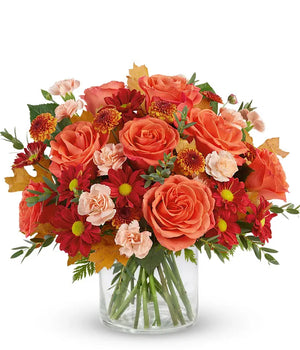 Send a burst of autumnal beauty to someone special with this vibrant floral arrangement. Featuring orange roses, miniature peach carnations, bronze button spray mums, and red daisy spray mums, it's complemented by seasonal greenery and makes a perfect gift to brighten their day.