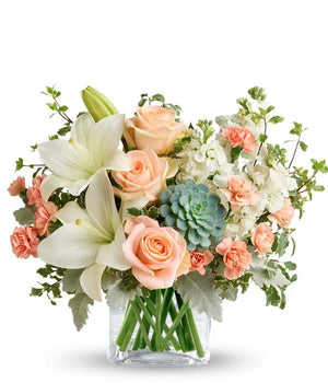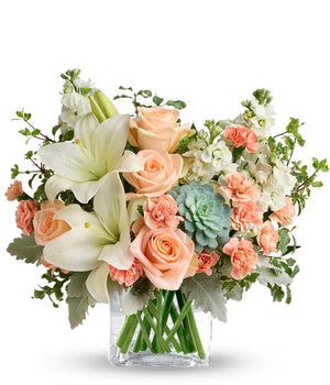 Looking for a modern twist on an old classic - this bouquet is just what you need! The Southern Peach Rose Bouquet brings you a subtle and sophisticated look with a bit of modern style. Charming and easy on the eyes, with beautiful pastel tones, this bouquet brings a room to life with it's artful appearance. Peach roses surrounded by white lilies, peach carnations and greenery - but the best part? All of this surrounds a green echeveria succulent. The fun new accessory to any bouquet, this delicate succulent adds a modern touch and is guaranteed to delight!