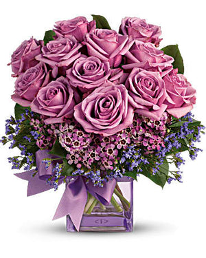 Fresh as morning dew. Beautiful blooms in all shades of purple are gathered into a purple glass cube vase and tied with a purple bow. How perfectly purple!