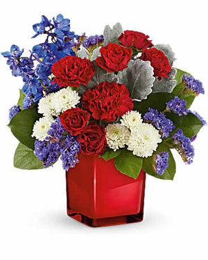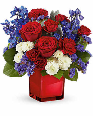 Embrace a timeless color palette of radiant red, white, and blue blooms, elegantly presented in a striking scarlet color splash cube.