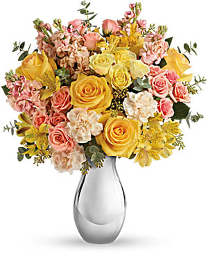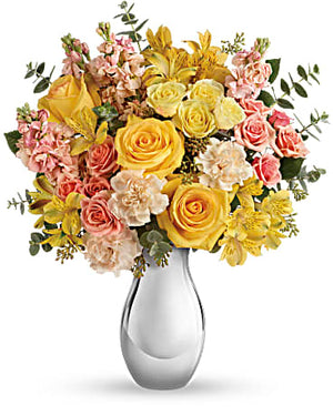 Soft, sunshiny blooms and a sparkling silver vase combine to striking effect in this magnificent bouquet. Its yellow and peach roses and keepsake vase are sure to make them smile, no matter the occasion!