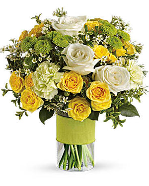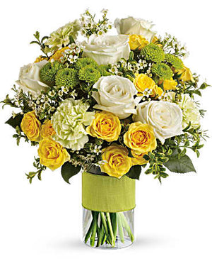 This charming bouquet includes white roses, yellow spray roses, green carnations, green button spray chrysanthemums and white waxflower accented with assorted greenery. Delivered in a glass cylinder vase.